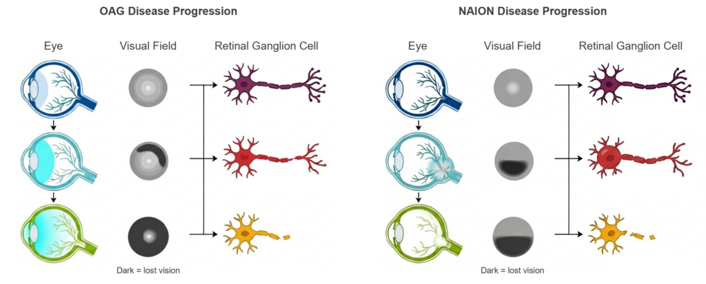 Optic neuropathies are a set of serious conditions that cause damage to the retinal ganglion cells (RGCs) of the eye, which are the neuronal cells responsible for transmitting visual signals to the brain. RGCs can be damaged by a range of age-related diseases, collectively termed optic neuropathies. Two such serious diseases are open-angle glaucoma (OAG) and non-arteritic anterior ischemic optic neuropathy (NAION).