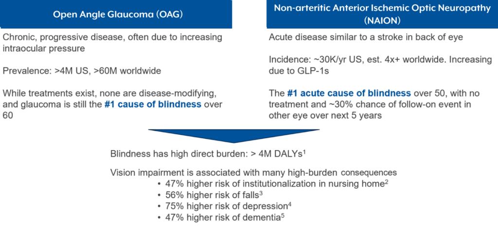 Hattenhauer, Am J Ophthalmol 1997, Johnson, J Neuroophthalmol 1994, Hayreh, Ophthalmol 2008, Quigley & Broman, Br J Ophthalmol 2006, JP Morgan, “Latest thoughts on the GLP-1 space”, Sep 2023, Hathaway, JAMA Ophthalmol 2024. 1:DALY = disability-adjusted life-year, a combined measure of morbidity and mortality, https://www.who.int/data/gho/data/themes/mortality-and-global-health-estimates/global-health-estimates-leading-causes-of-dalys. 2. Evans, “Risk of admission to a nursing home among older people with visual impairment in Great Britain”, JAMA Ophth 2008. 3: Li, “Risk factors for falls among community-dwelling older adults: a systematic review and meta-analysis”, Front Med 2023. 4: Virgili, “The association between vision impairment and depression: a systematic review of population-based studies”, J Clin Med 2022. 5: Shang, “The association between vision impairment and incidence of dementia and cognitive impairment: a systematic review and meta-analysis”, Ophthal 2021.