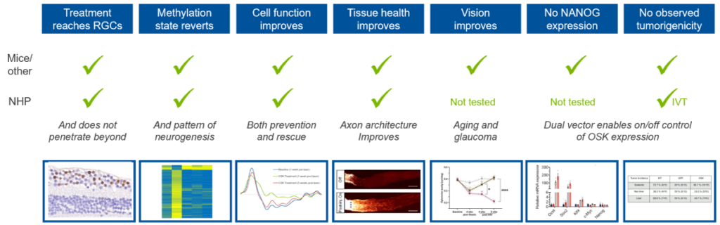 Life Biosciences’ lead candidate, ER-100 (AAV2-OSK), is in Phase I clinical trials for optic neuropathies. This is the first-ever partial epigenetic reprogramming candidate approved for clinical trials, and if successful, treatment with ER-100 would be the first time cells have been rejuvenated in humans.1,2